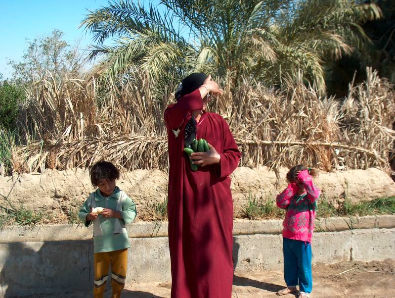 Ook de vrouwen die buiten de was aan het doen zijn komen nieuwsgierig naar de vreemdelingen kijken en bewonderen mijn ketting, waaraan mijn naam in Arabisch schrift.