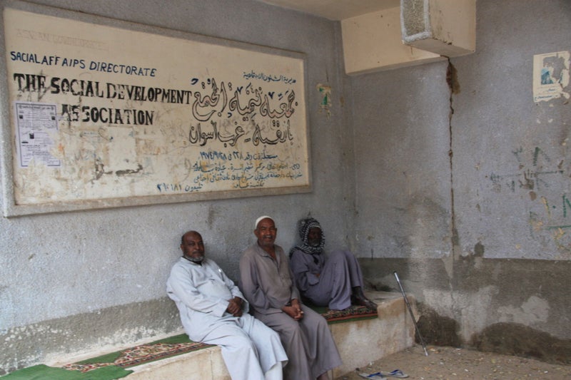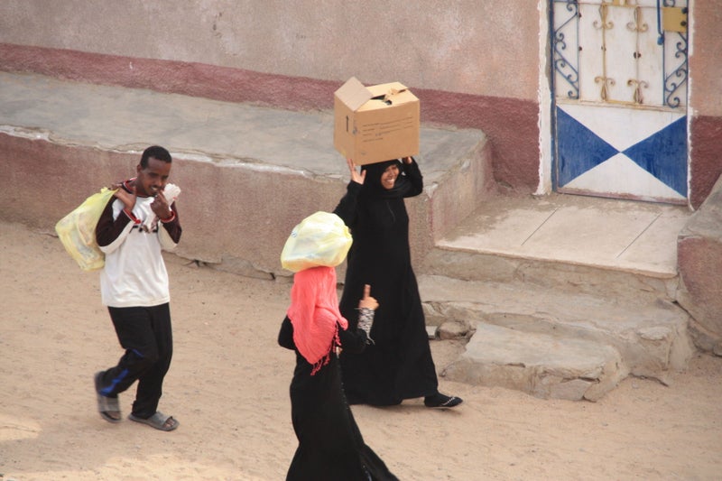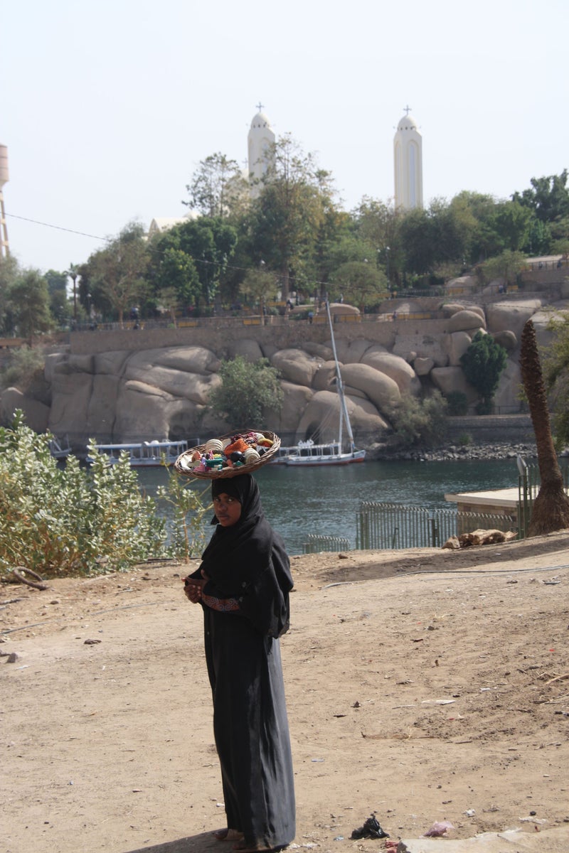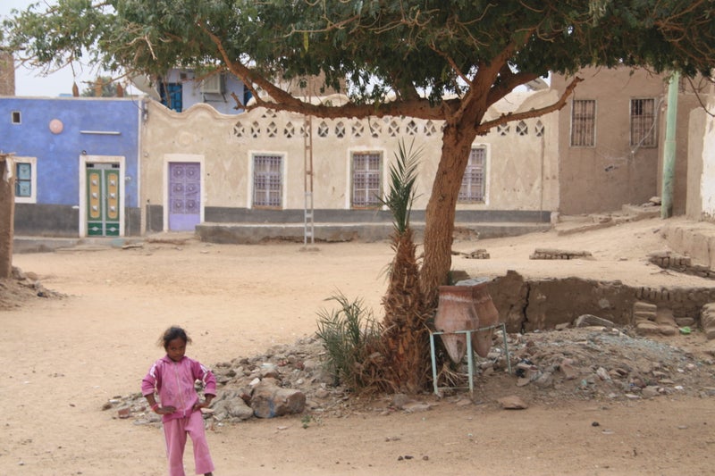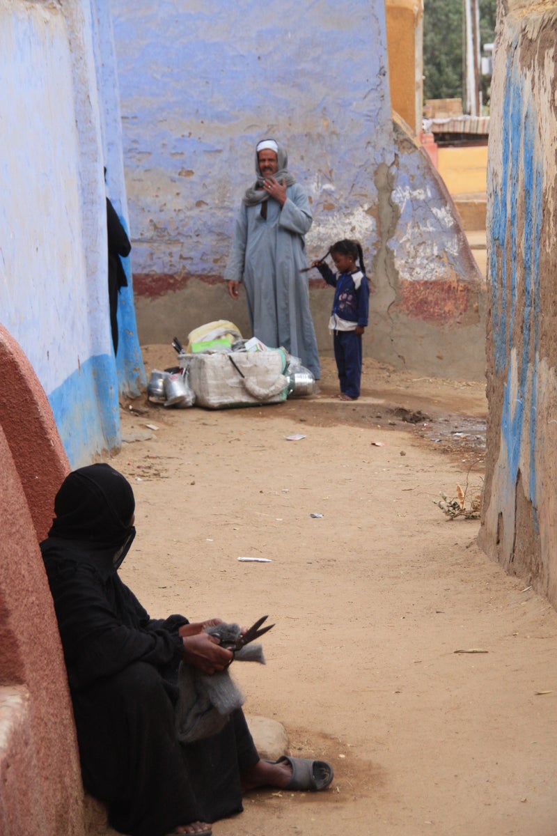 We zeilen via de catacracten naar het 4km verderop gelegen eilandje Sehel. Als we aan wal klauteren biedt een zwaar gehandicapte man zich aan als onze gids. Waarschijnlijk het resultaat van inteelt, wat hier veel voorkomt. Door veel Egyptische families wordt een huwelijk tussen neef en nicht nog steeds als een goede keuze gezien. Met één been en een houten stok die hij als kruk gebruikt gaat hij ons voor om het dorp te laten zien. Behendig huppelt hij met zijn versleten plastic slipper de heuvel op en is sneller boven dan ik. Het is vreselijk triest om te zien, maar wel geweldig dat deze man zo een dagbesteding heeft en kan bijdragen aan zijn levensonderhoud. Hij lijkt er plezier in te hebben om ons rond te leiden en blijkbaar wordt het hem van harte gegund door zijn dorpsgenoten. We worden verder door iedereen met rust gelaten op onze wandeling door het dorp dat gebouwd is voor de voormalig bewoners van het land dat door de bouw van de Hoge Dam overstroomd was.