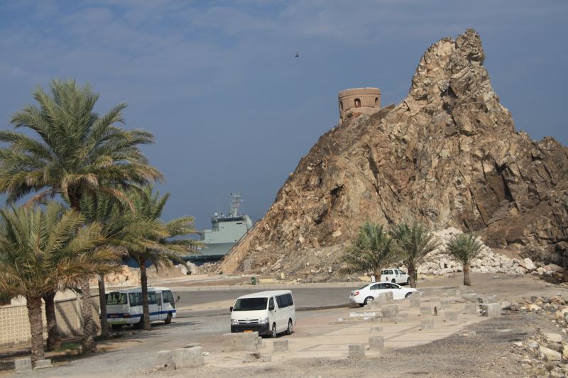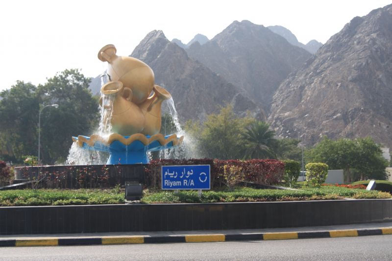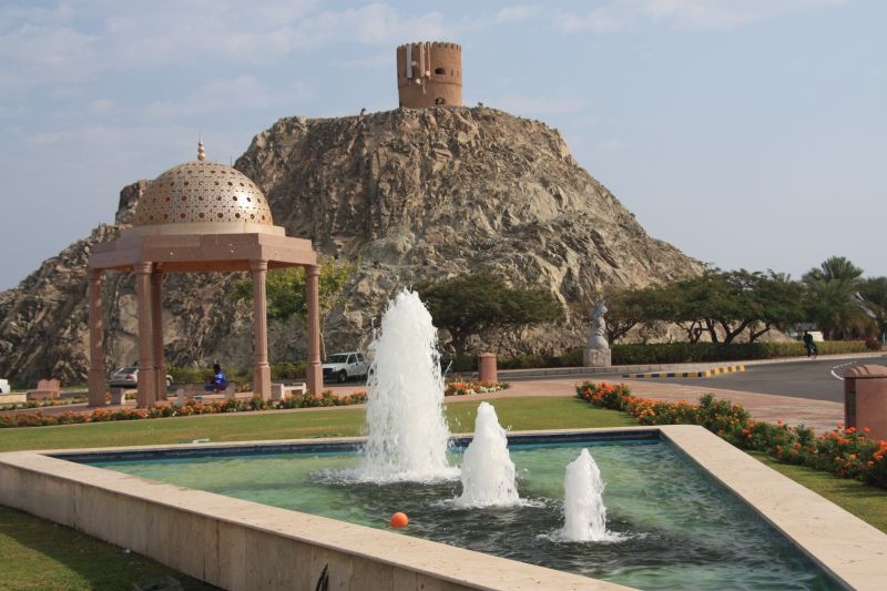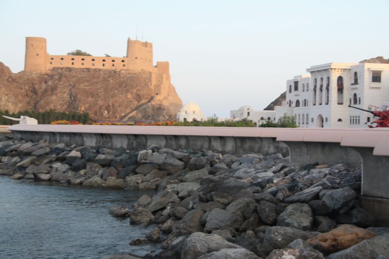 Het is een mooie wandeling van de haven over de corniche langs de kustweg aan de smalle en indrukwekkende baai. Het aan de linkerkant liggende Riyam park wordt bewaakt door een uitkijktoren in de vorm van een reusachtig wierookvat.